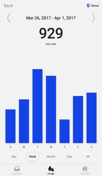 - In this example, the week of March 26 – April 1 is shown. The overall usage for the week was 929 gallons. Tap the bar for a given day to see how much water was used that day.