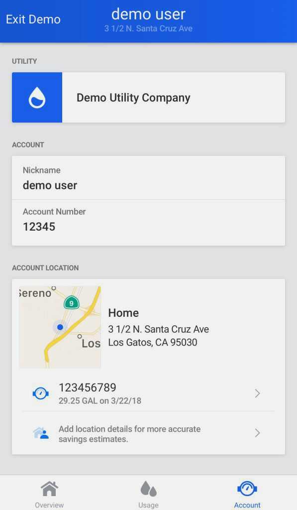The Account page lets you see your account details. In addition, your account location is displayed on a map along with your meter ID number.