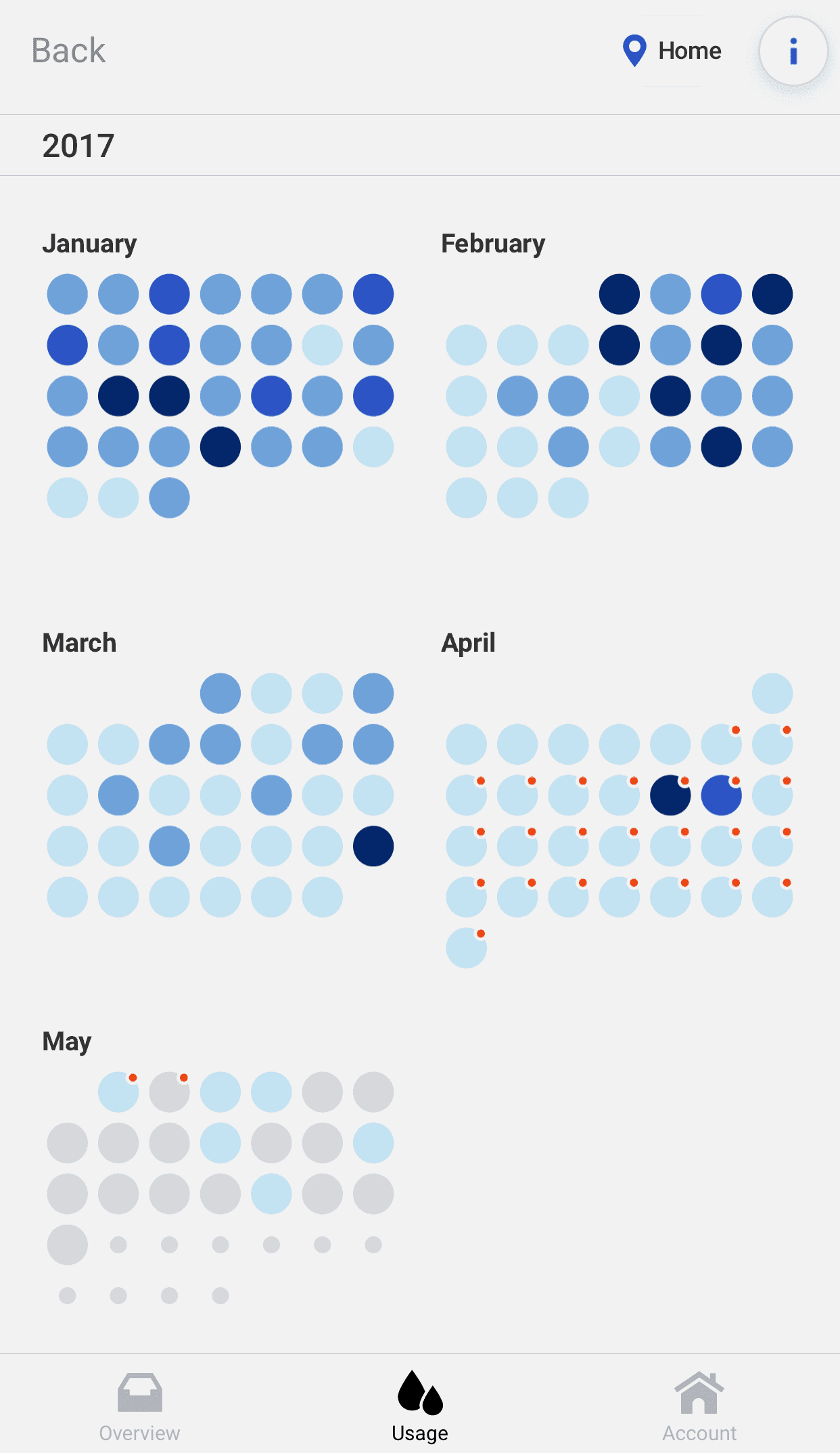 Tap the Calendar section of the Usage page home screen to see your usage trends as a “heat map” in which light blue dots indicate less use, darker blue dots indicate more use. Red dots denote leaks. Tap the i to open the Usage Key.