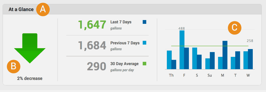 The left-most (B) portion of the At a Glance section shows you the percentage increase or decrease of usage over the prior week. The middle portion shows you exactly how much water you consumed during the last seven days compared to what you used during the seven days before that. Your average daily use is also shown.