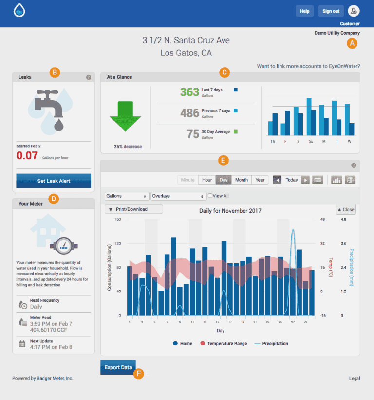 The bar graph on the right (C) shows even more detail. Hover your cursor over the bars to see how much water you used on a given day and compare it to the same day of the previous week. The horizontal green line shows your 30-day average use.